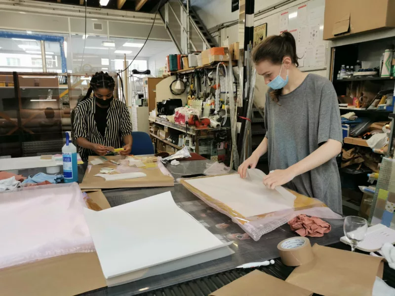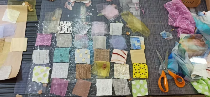 Par ailleurs, une seconde stagiaire rejoint l’équipe et apporte un regard complémentaire. Ensemble, nous travaillons sur un verre en relief inspiré du monumental. Nous recherchons un effet nacré subtil, avec une dominante rose obtenue grâce à l’organza. Cette matière légère crée une vibration délicate qui enrichit encore notre palette de textures et d’expressions.