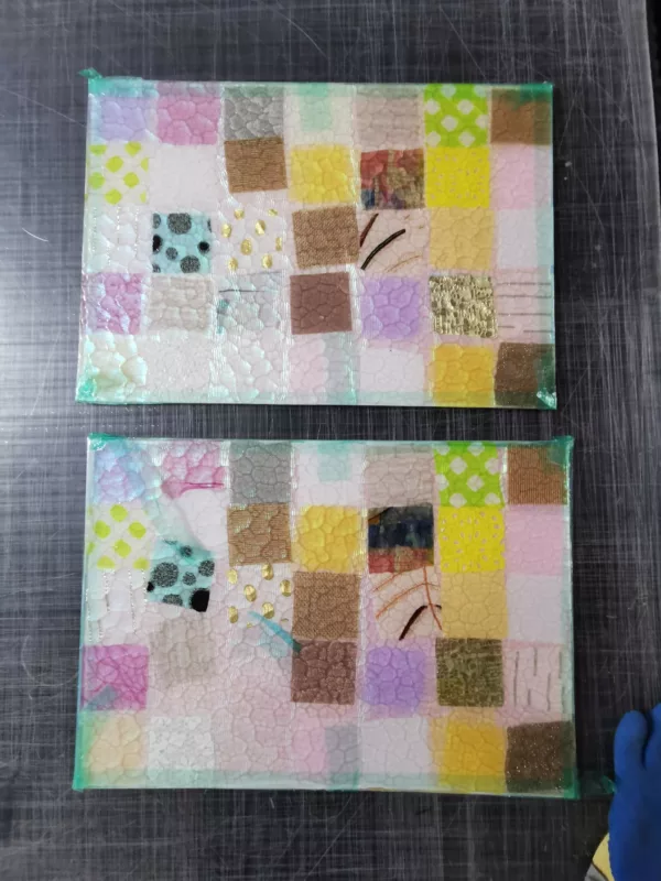 Tout commence par un projet mené avec une stagiaire en BMA du Lycée Lucas de Néhou. Nous souhaitions explorer le potentiel du patchwork dans un assemblage décoratif, et nous disposions justement de magnifiques tissus issus de la société Janssens et Janssens. Ainsi, l’idée de créer un verre décoratif plus léger que les verres feuilletés traditionnels s’impose naturellement.