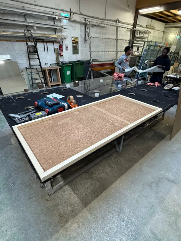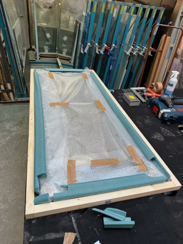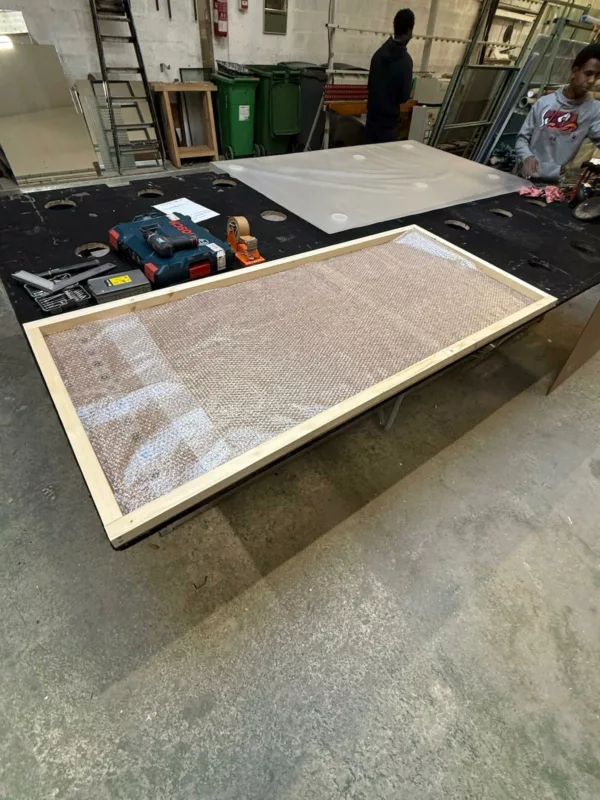 Nous fabriquons une caisse robuste, parfaitement adaptée aux dimensions du verre et aux contraintes du transport.