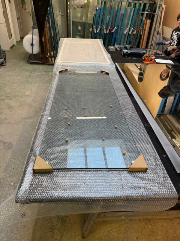 De notre côté, nous fabriquons un nouveau verre trempé adapté à votre modèle et nous préparons une caisse en bois robuste et sécurisée.