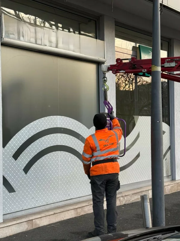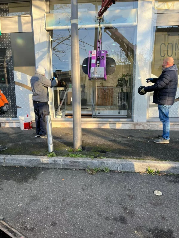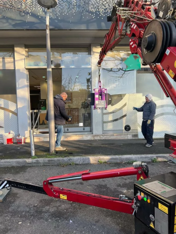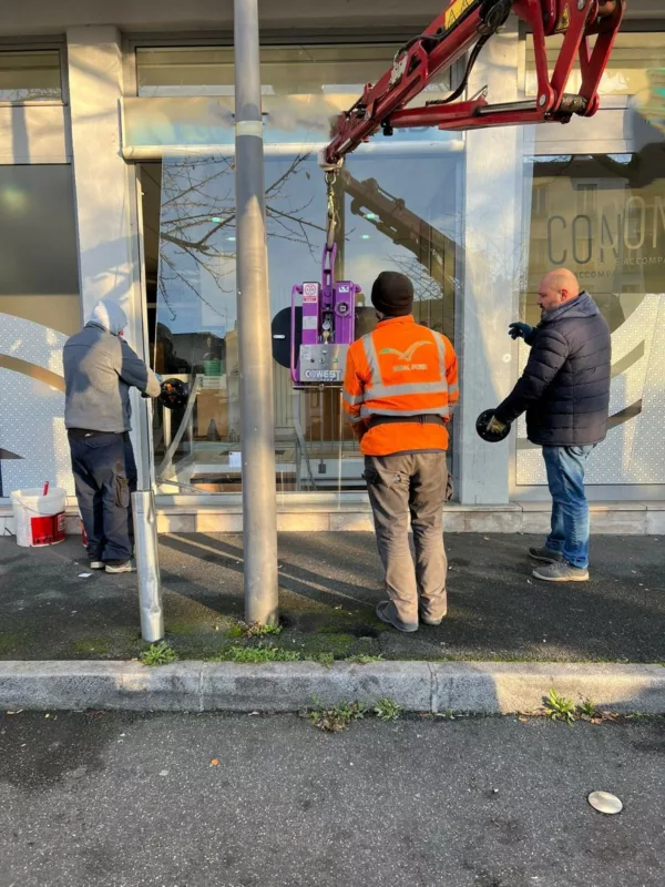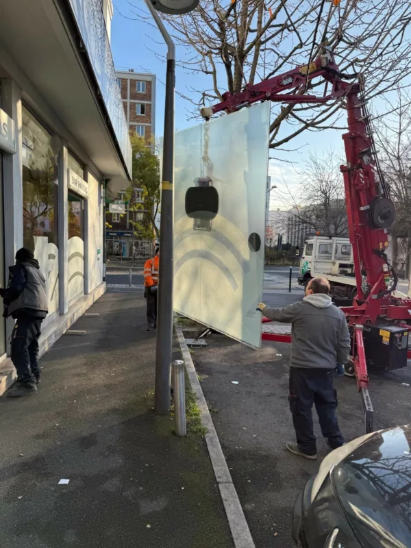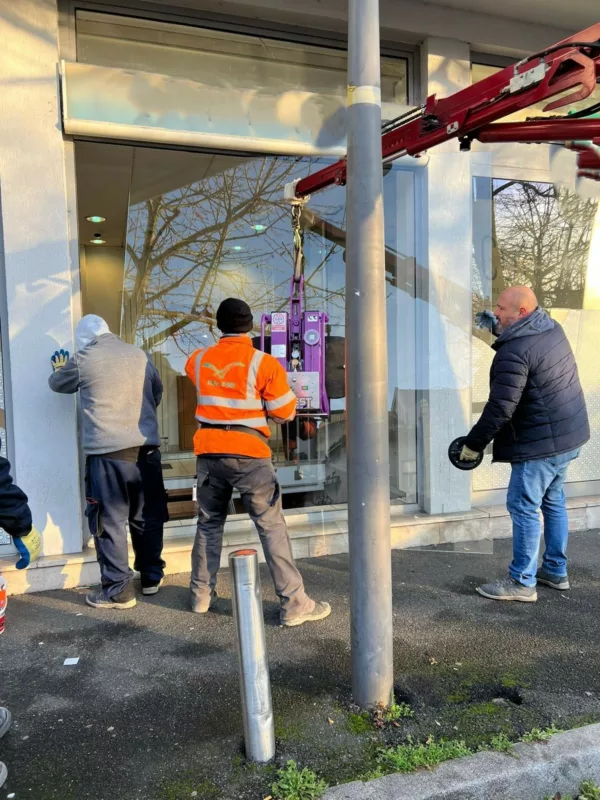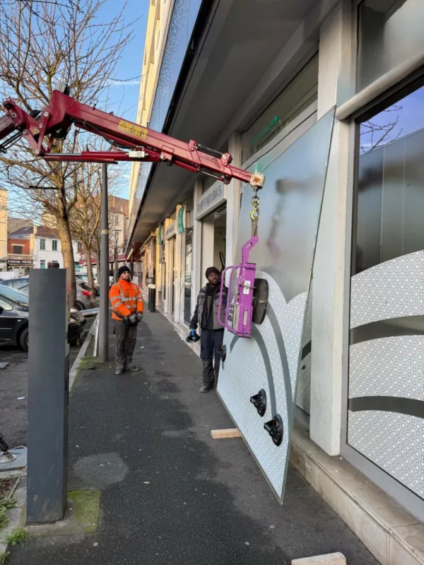 Pour manipuler et positionner ce vitrage imposant, nous utilisons une grue araignée équipée d’un palonnier à ventouses. Grâce à ce matériel, nous levons et orientons la vitre avec précision et en toute sécurité. Nous réalisons cette opération en partenariat avec Idéal Pose, qui nous accompagne sur les interventions nécessitant un levage contrôlé. Ainsi, nous garantissons une installation fiable du début à la fin.