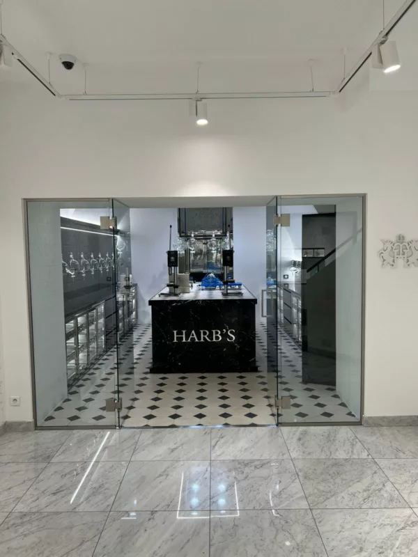 Dans un espace commercial haut de gamme à Paris, HARB’S a choisi une cloison en verre séparative pour délimiter son comptoir central tout en conservant une ambiance lumineuse et ouverte. La solution : deux parties fixes en verre trempé 10 mm et deux portes centrales équipées de charnières Bohle hydrauliques. Le résultat ? Un design épuré, sécurisé et fluide.