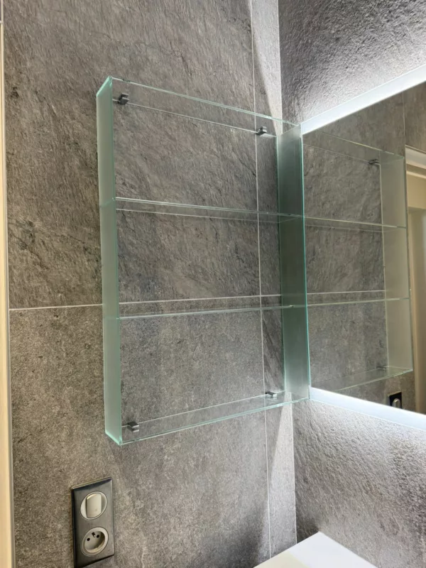 Un meuble en verre sur mesure qui habille votre salle de bain en espace design, fabriqué dans la plus pure tradition artisanale dans notre atelier de Boulogne Billancourt.